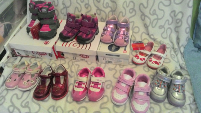 Верхние демисезон обошлись в 900 р. и 1100, минимен сандали 1750 р., Агата туфли 1000р., Какаду (розовые чисто кож.туфли) 500 р., Антилопа красные 500 р., кроссовки по 400 р.