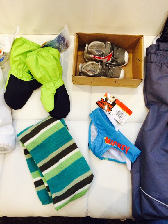 Штаны по 300 р. , шарф 100, плавки 130, краги 400, сандалики 900)