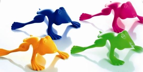 Довольно азартная игра. В моем детстве была похожая. Но вот сами лягушки мне не понравились, пластик тонкий и прыгают плоховато. У нас есть другие, вот ими прыгать одно удовольствие. Задача проста - попасть в "корытце" как можно большим количеством лягушек одного цвета.