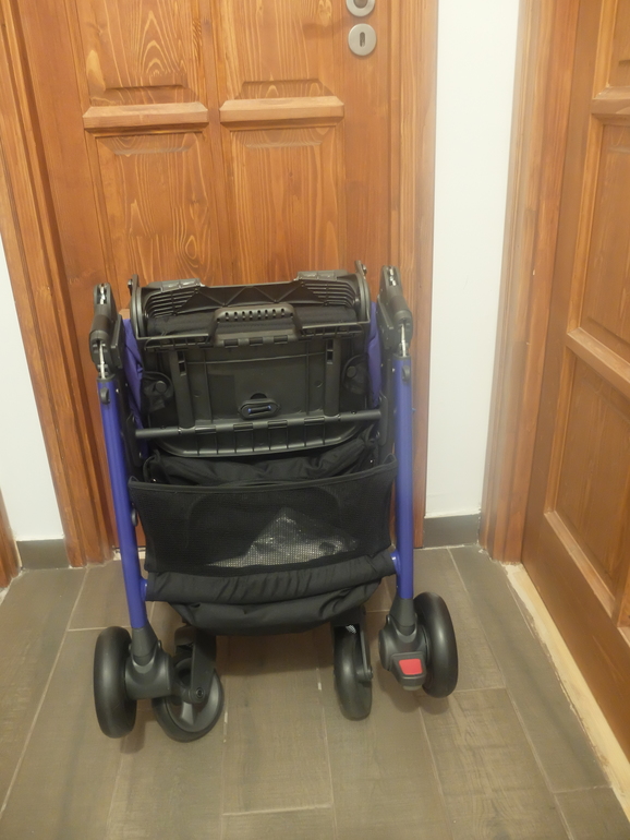 + Даже не плюс, а плюсище. Коляска реально складывается и раскладывается одной рукой. Даже моей, не самой умелой, надо заметить, рукой. В сложенном виде коляска прекрасно стоит себе сама и занимает минимум места (на фото ниже).