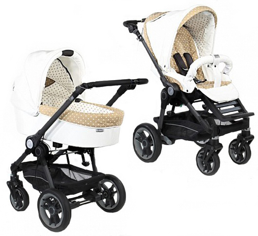 А затем я увидела эту коляску у одной девушки в торговом центре, а на следующий день - у другой девушки в районной поликлинике. Посмотрев на коляску в этом цвете со стороны, я поняла, что эта расцветка - точно «не моя». Переключила внимание на цвет Paris Romance - белая эко-кожа с текстильными вставками бежевого цвета в горошек.
