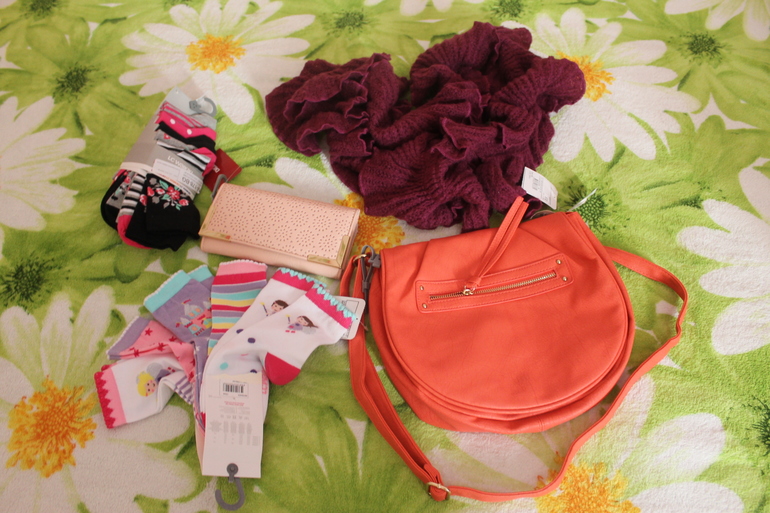 Взяла на лето коралловую сумочку под босоножки и кошелек все хорошего качества, функциональное. Носки и шарфик тоже отличные.