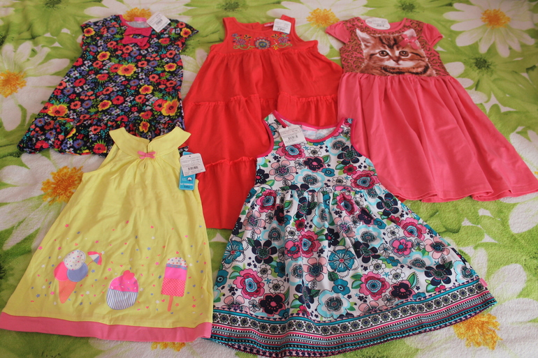 Платья взяла разных размеров (с учетом племянниц) все х/б на лето. Тоже с размером интересно получается, желтое взяла дочке размер 24-36 м., сейчас ей 2,2 но оно с большим запасом, рядом с ним в цветочек идет на 5-6 лет, а разница всего в 2см...