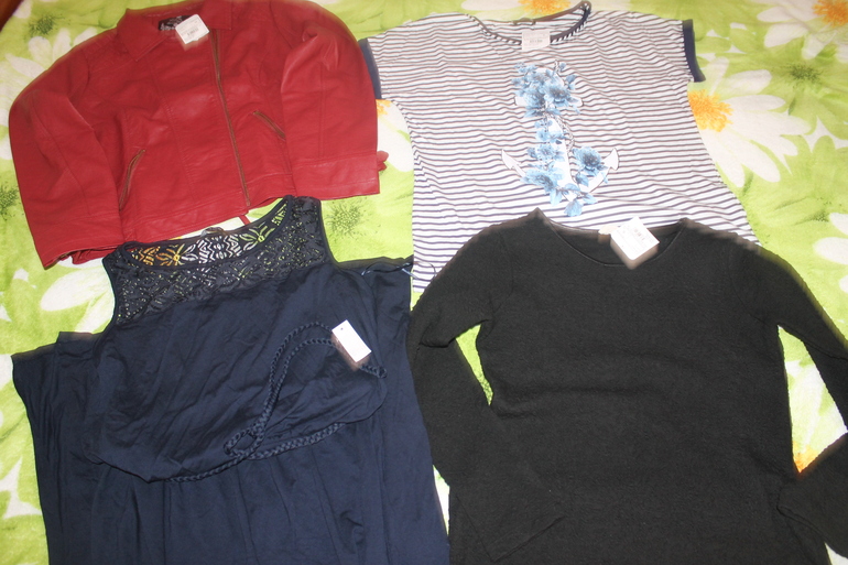На себя взяла простеньких вещичек на пробу, чтобы понять размер. Получается на мой обычный 48 размер, надо брать 42, т.к. 44 велик или L, хотя черное платье XL село нормально... Курточка красная понравилась, пошита хорошо без запаха. Платье темно- синее большемерит, на лето хорошо, приятный трикотаж. Черное платье в размер тепленькое. Футболка большемерит, довольно тонкая и широкая. В общем на себя вещи выбрать тяжеловато, сейчас джинсы понравились но какой размер не представляю...