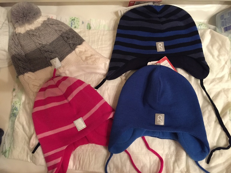 Шапки Reima на завязках синие до 50 размера. Рыжие лисички полно до 50 размера.