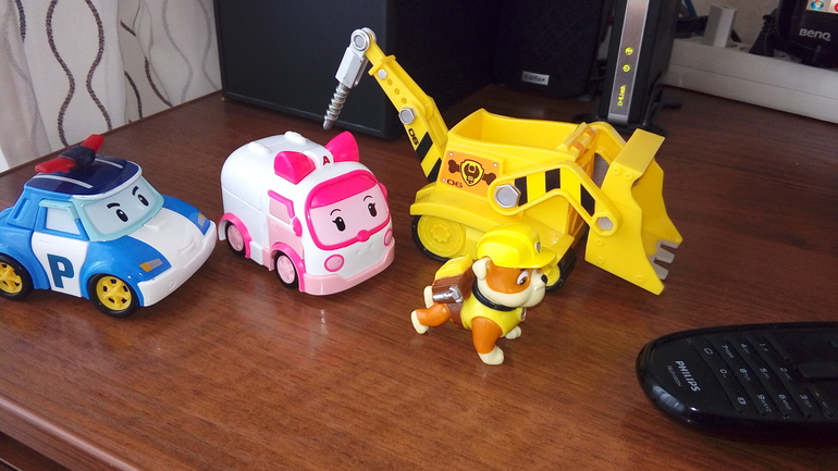 пластик хороший,не пахнет. не треснул еще,хотя перепадает ему сильно.. интерес пропал ,как то щенячий патруль на месяц затянул и забыл . мы теперь сидим на лего и рабокар поли.вот для наглядности размер, примерно 15 см на 10 машинка и Крепыш 5 см высотой.