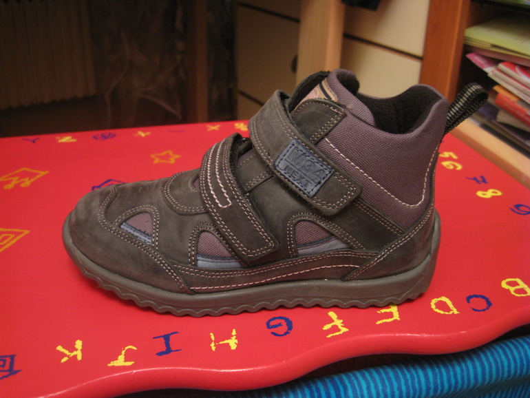 Ну так, не деревянная, но и не как суперфит какие-нибудь, пожестче. Но они легкие и ребенок ходит без проблем. Подошва мембранная, дышит, не промокает, все проклеено, мысы укреплены. Приличные ботинки, короче) на слякоть у нас тоже лемиго