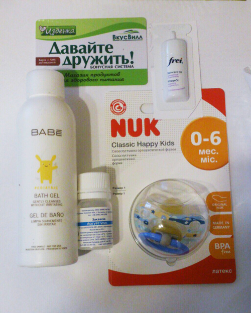 соска Нук, карточка Избенки с 500 рублями на ней (приятненько, каждый день к ним хожу), средство для купания малыша и какая-то закваска для йогурта, надо почитать что это