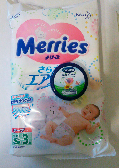 Пробник крема Бюбхен и подарок от Меррис 3 подгузника и махровое полотенчико