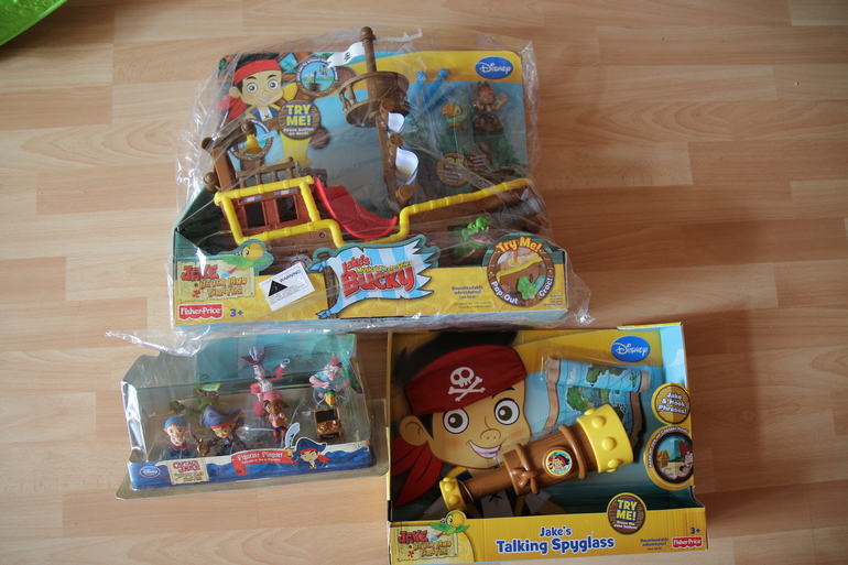 Корабль, набор фигурок и набор - подзорная труба, пиратская повязка и карта сокровищ.