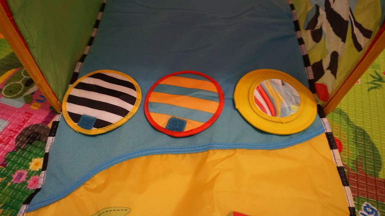 Коврик под крокодилом шумящий. Круглые элементы на липучке. В зебре погремушка, под солнышком -зеркало. Все шуршит.