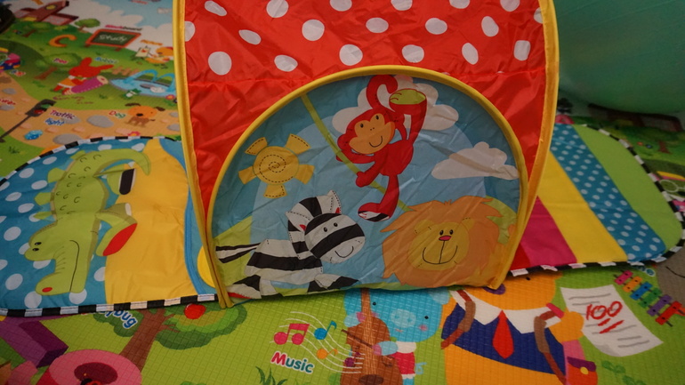 Распродажи. Скидки. Акции.Состоит из двух раздельных тканевых элементов (шатра 40*40*40см и *пола* 40*120см), нескольких круглых подвесок на липучке, мяча с погремухой и звуковой коробочки, которая при касании проигрывает звуки джунглей