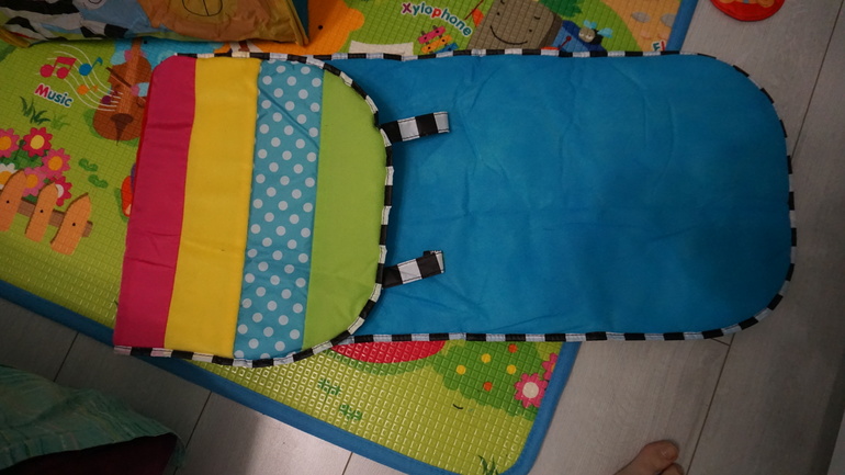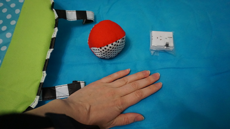На оборотной стороне коврика - липучки и хлястики (не поняла идею). Мяч и проигрыватель.