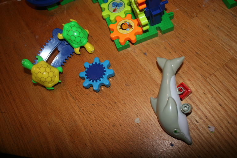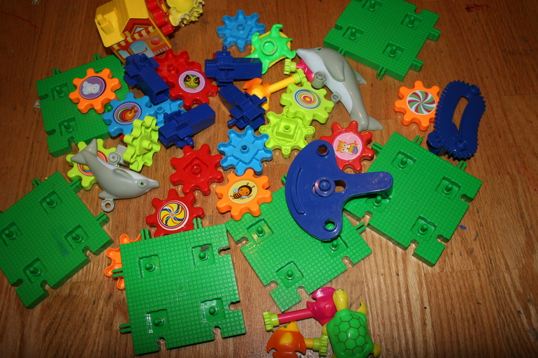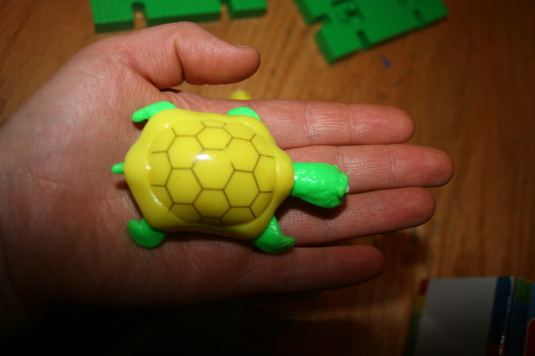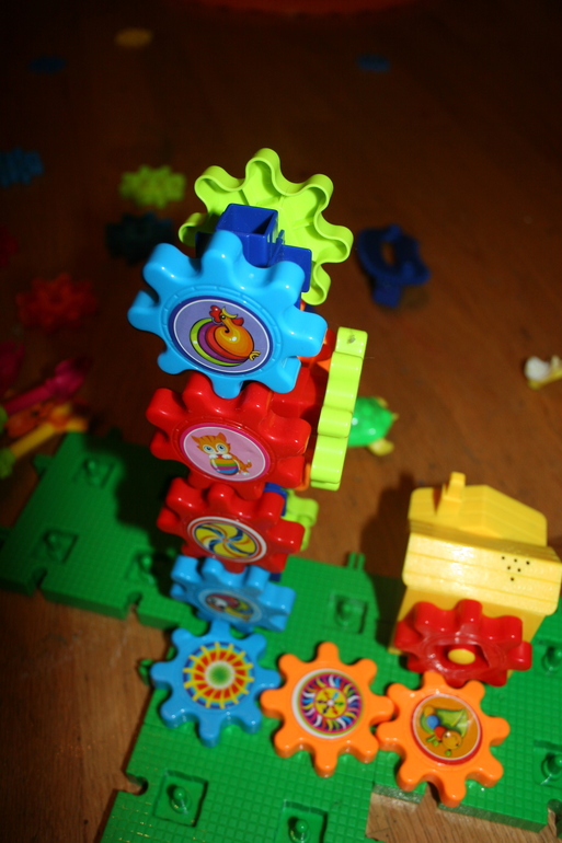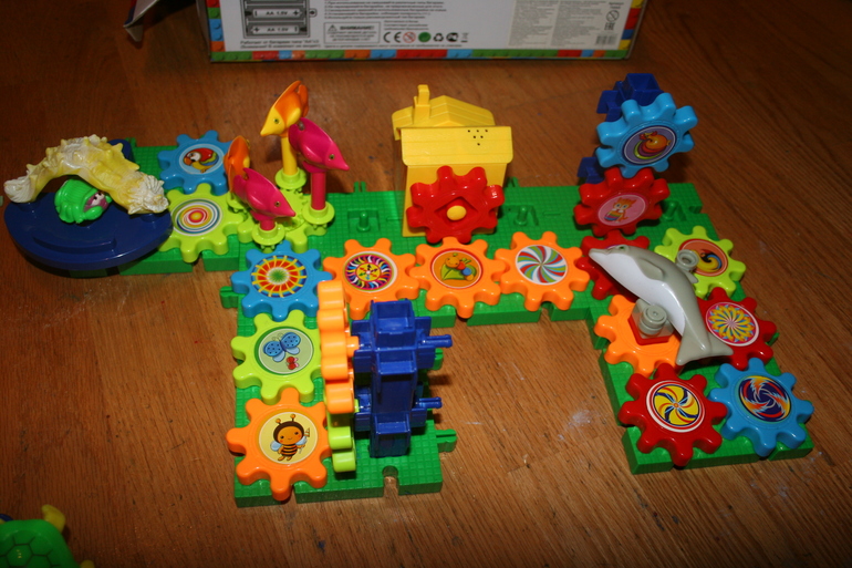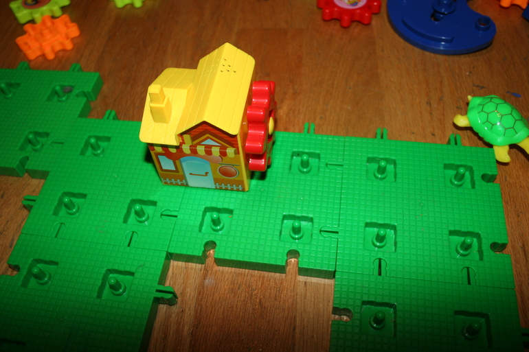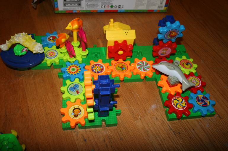 А вот черепах я пока не научилась пристраивать. Как-то они должны функционировать в сочетании с сине-голубой шестеренкой. Еще на фото отсутствует шестеренка с ручкой (она работает только при отсутствии домика, его нужно отставлять). Ну и несколько обычных шестеренок, и парочка особенных - они нужны для "башенок", чтоб на нних крутились шестеренки со всех сторон.