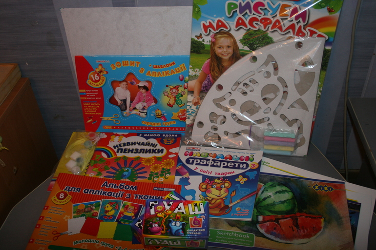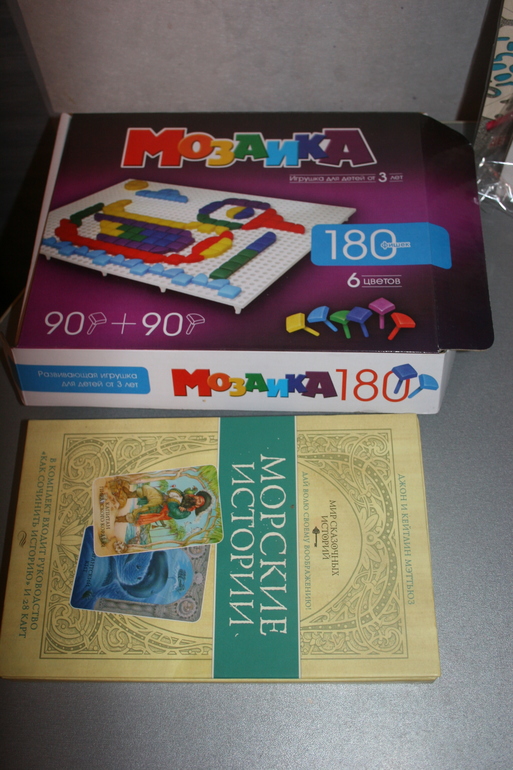 Очень много всего подарили, активно юзаем. Младшему очень понравился альбом аппликаций с тканью.