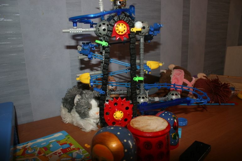 Один небольшой минус - шестеренки не крепятся, а надеваются на штырьки. Но, так как конструктор изначально предполагает исключительно горизонтальное положение в собранном виде, то это уже роли не играет. А ребенок теперь хочет оба варианта - и Quercetti тоже, т.к. "там можно сделать кубик и бегать с ним" )).