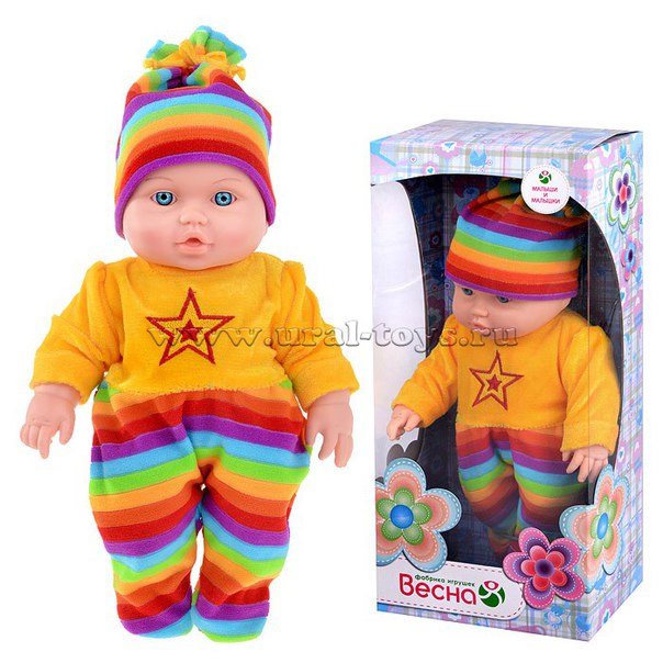 У нас тоже от Весны. Уже три с половиной года как он у нас живет - цел. Единственный недостаток, что пупсы этой марки конкретно либо мальчики, либо девочки. Но у нас девочка попалась. Пупс обычный без музыки и функций всяких. Купали, но часто делать это не советую - воду вытряхивать тяжело. Горшки для кукол отдельно продаются. В майшопе были, в обычных магазинах - не видела. Сам пупс сделан достаточно качественно, и на личико вполне милые.