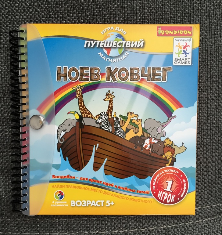 А эта отличная игра удобна - можно брать с собой куда угодно - в ту же поликлинику или в машине - будет чем заняться. Есть задания - от простого к сложному. Несколько фигурок поставлено на поле - нужно остальных поместить в ковчег так, чтоб каждые животные по паре были рядом друг с другом.