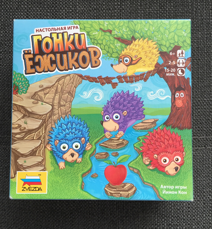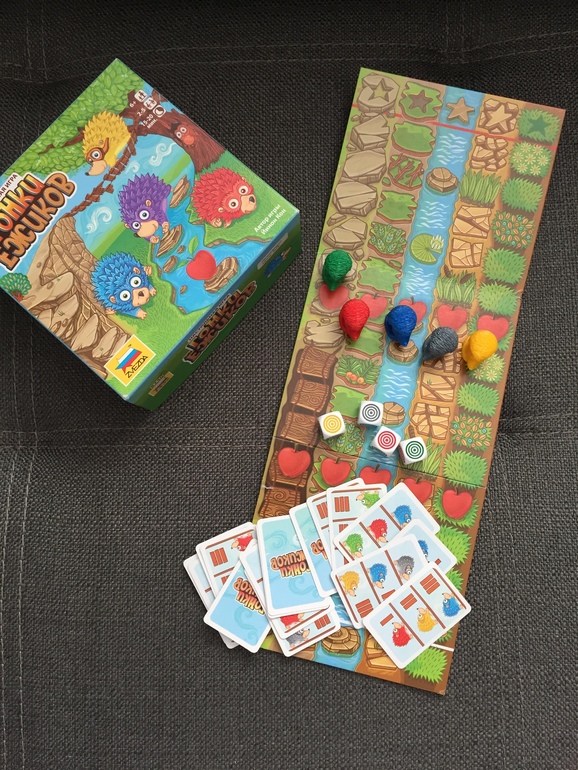 Следующая игра "Гонки ежиков". Долго она лежала невостребованной - никак не могли вникнуть в правила, но зато теперь у нас прям турниры по вечерам))) Азартная игра))) от 2 до 5 чел. Чем больше - тем интереснее))) В игре игровое поле, 5 ежиков, карточки с заданиями и кубики. Каждому игроку выдается карточка с заданием, на которой показано какой ежик должен прийти первым на финиш, какой второй и третьим. Соответственно у каждого игрока задание свое и каждый гонит своего ежика к финишу) Написано 6+, но мы в нее лет с 4,5 играем