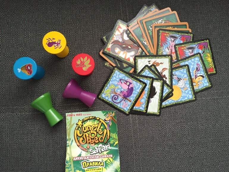 Дикие джунгли Сафари. В эту играем частенько. В комплекте пять тотемов и цветные карточки. Карточки делятся на количество игроков. Каждый игрок открывает свою карточку и нужно первым схватить нужный тотем с изображением еды того животного, что на карточке. кто первый - тот кладет эту карточку в свою колоду. У кого в конце игры карт больше тот и выиграл. Есть карточки с охотником - нужно успеть защитить свою колоду, есть нейтральные, есть с заданием изобразить животное) В общем интересная игра.