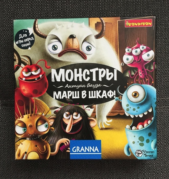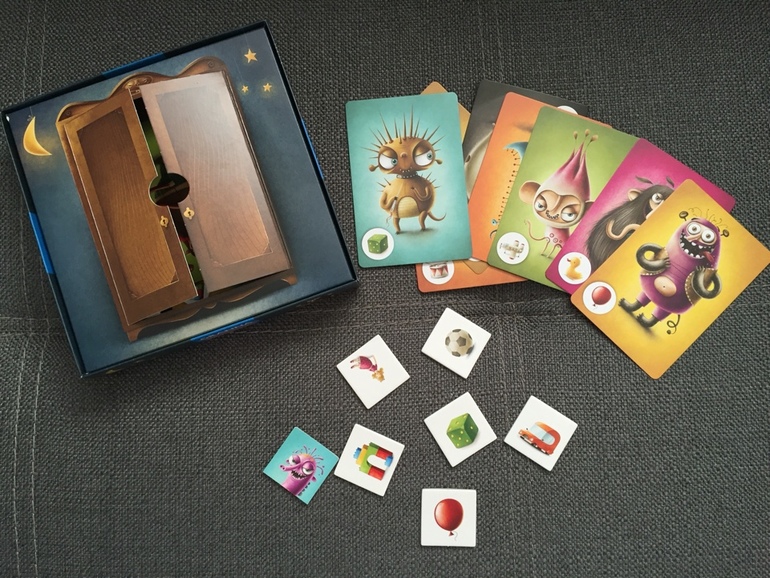 Это последнее наше приобретение - Монстры, марш в шкаф! Игра на память. Есть колода карт с изображением монстров и того, чего этот монстр боится. И карточки со страхами. Карточки раскладываются по кругу рубашкой вверх. Колода с монстрами в центр. Открываем монстра - далее цель - найти карточку с его страхом - тогда монстр спрячется в шкаф.
