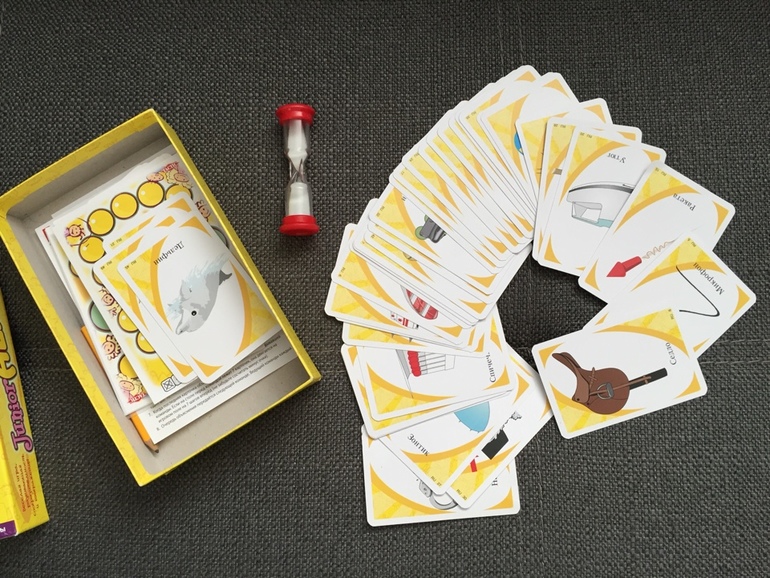 Еще одна игра, в которую хоть и играем, но очень редко - больше его песочные часы из нее интересуют))) Цель - объяснить своими словами то, что нарисовано на твоей карточке. Стоит 5+, но по мне это на гораздо меньший возраст...