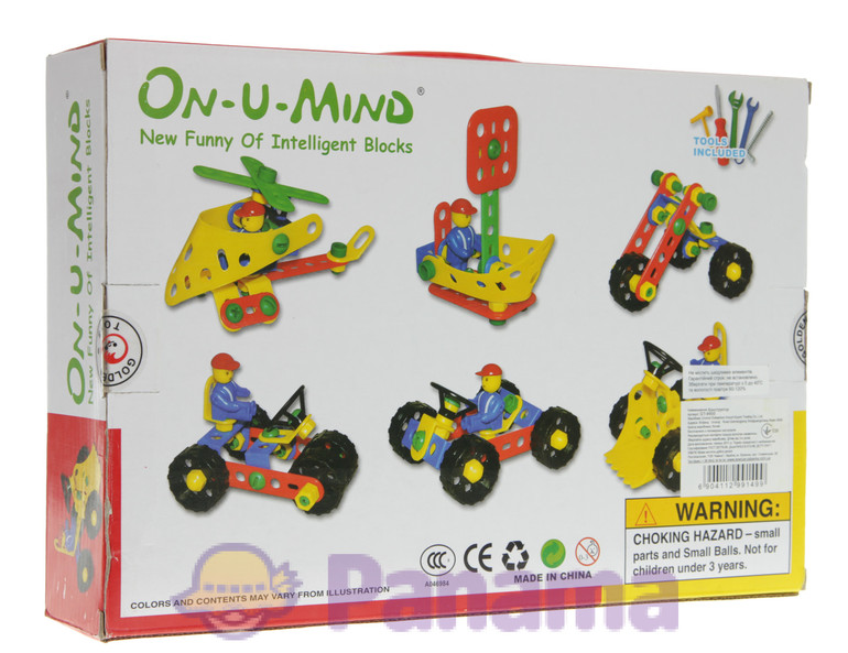 Он с инструментами (5 штук). Есть разные типы винтов. Видимо, под все виды инструментов. ребенок учится крутить разными типами и правильно подбирать. Детальки интересные - есть гнутые, есть руль, и должны, по идее, хорошо крутиться колеса. И есть человечек, с которым можно играть, можно собрать машину и усадить его. Еще его можно брать в ванну и делать кораблики.