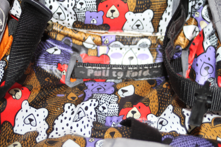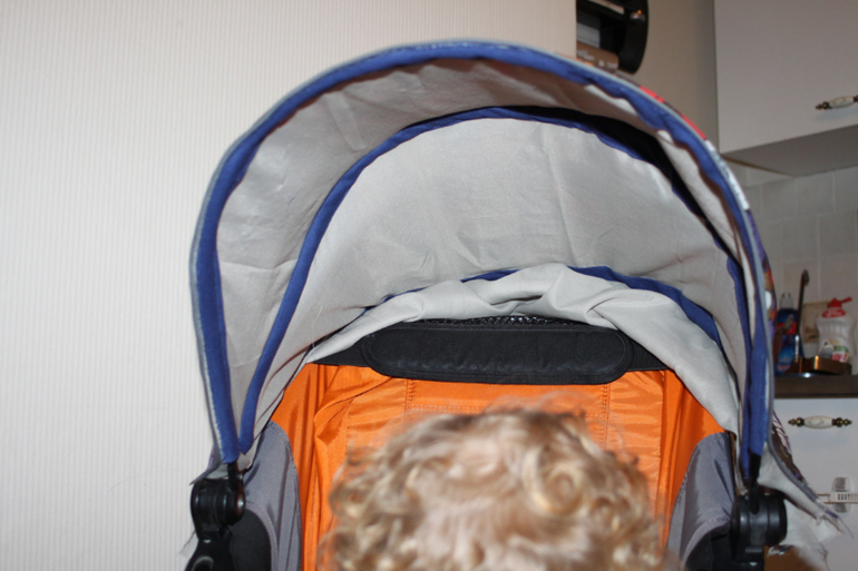 сбоку висит ремень от сумки, им я фиксирую спинку под 90градусов, когда ребенок сидит. плюс в спинке вставлен прямоугольный кусок оч плотного пластика, который не дает спинке превращаться в гамак.