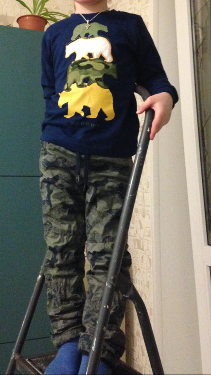 Ширина жёлтых штанов по сравнению с теми, которые мы сейчас носим и они нам чуть свободны, по длине не смотрите, камуфляжные сыну с большим запасом по длине, хотя размер 4года: