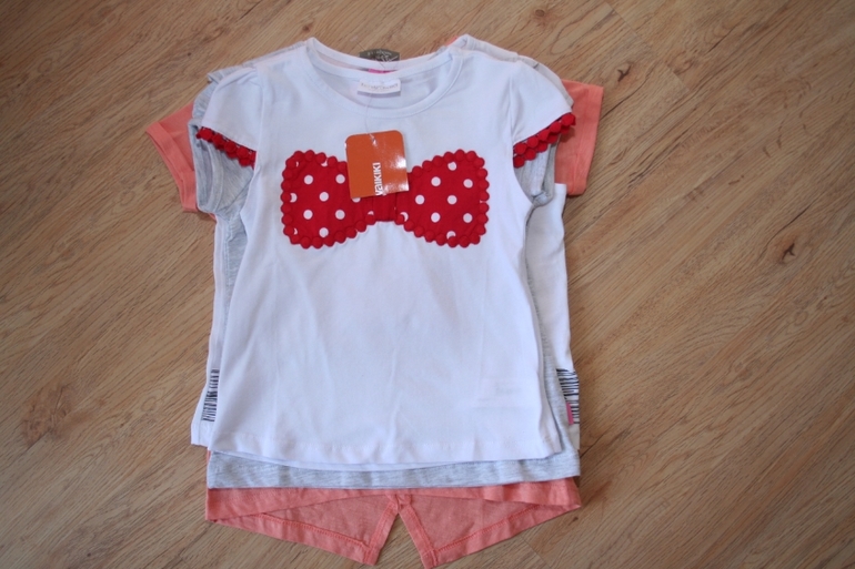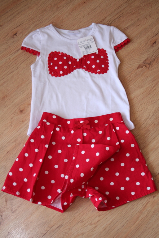 Вначале комплект в горошек. Размер 3-4 года. Он шел без скидки, но оооочень понравился. Я вообще не равнодушна к бело-красному гороху, поэтому был куплен не глядя на цену. Модель сшита как будто специально на нас, высоких и худеньких. Качество отличное, а самое главное шортики сделаны юбочкой, очень удобно и красиво!