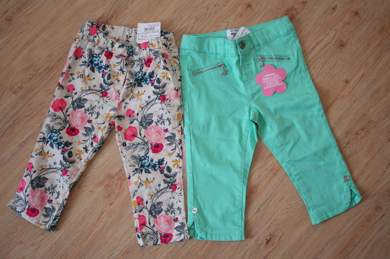 Капри 3-4 года. Ох, как я долго ловила эти мятные! ))) Не потому, что нравятся, а дело принципа. Три раза их клала в корзину и пока оформляла - они исчезали. Идут в размер, но лучше бы сидели на плотненьком ребенке. По мне, так их до 5-6 лет можно будет носить, ткань тянется. Сейчас они нам ниже колена.