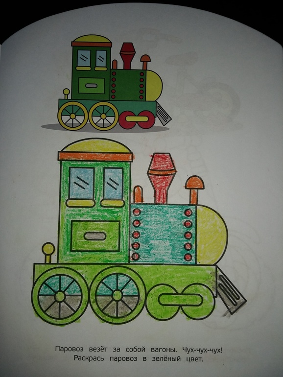 Раскраски Play-Doh стали цветными буквально за 10 мин. Художник-испытатель немного испачкал руки, но требовал продолжения эксперимента! В дело пошла раскраска «Транспорт». Паровозик очень быстро стал ярким и сочным.