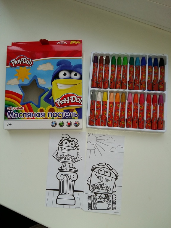 Симпатичная коробочка, а в ней… А в ней нас с моим главным художником-испытателем ждала МАСЛЯНАЯ ПАСТЕЛЬ Play-Doh аж 24 цвета и парочка небольших раскрасок!