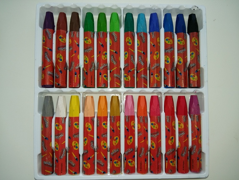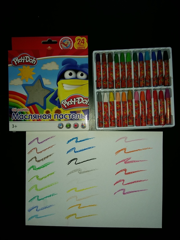 Масляная пастель Play-Doh на вид напоминает нечто среднее между мелками и восковыми карандашами. Пахнет обычной свечкой. Никаких приторных отдушек. Немного пачкает руки, но, как и обещал производитель, смывается водой. Цветовая гамма довольно разнообразная - 24 сочных цвета.