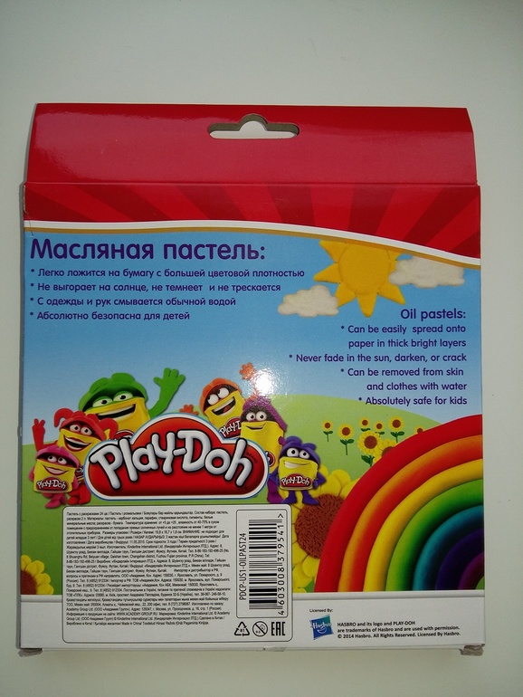 Долго изучая упаковку (и особенно то, что пишут мееелкими буквами) я выяснила, что произведена эта масляная пастель в Китае из следующих ингредиентов: карбонат кальция, парафин, стеариновая кислота, пигменты и белые минеральные масла. Температура хранения от +5 до +25 с предохранением от прямых солнечных лучей и отопительных приборов. А еще масляная пастель Play-Doh не подходит детям до 3 лет.