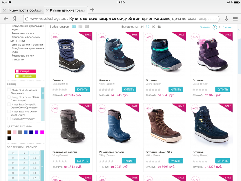 Людмила в Выбор товаров 10 лет Viking в Весело шагать 50% Распродажи. Скидки. Акции. Скидка на зиму 50% Посмотрите еще 20 записей на эту тему Отменить Ответить Дарья А не знаете долго еще акция будет проходить? 21.03.2016 Ответить Людмила Не знаю, на сайте написано с 26.12.15 ещё а до какого не знаю 21.03.2016 Ответить Елена только размеров нужных практически не осталось( 21.03.2016 Ответить Людмила Но может для кого то и есть)))) у нас маленькая ножка, поэтому можно выбрать 21.03.2016 Ответить Танюшка странные скидки))) в начале января тоже было -50,но цены были ниже 21.03.2016 Ответить Людмила Я сейчас на сайте посмотрела у них такая акция с 26 декабря была))))вчера просто в магазине обратила внимание, а сейчас на сайт решила залезть 21.03.2016 Ответить Девочки,поделитесь пожалуйста кодом на скидку 10% в Эльдорадо!Хочу купить игрулю! Размерность кроссовок минимен Чаты Беременных Выберите чат: Январята-2026 Февралята-2026 Мартята-2026 Апрелята-2026 Майчата-2026 Июнята-2026 Июлята-2026 Августята-2026