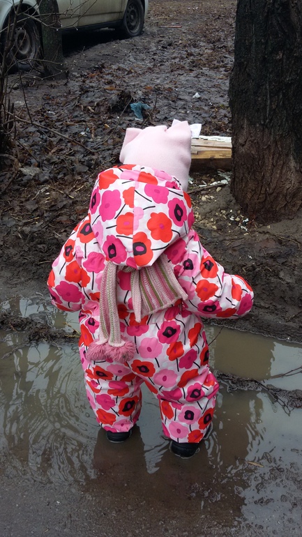 Теперь о хорошем ))) Внешняя ткань приятная, не слишком деревянная, но хорошо отталкивает грязь и влагу. Сегодня дочка стояла под капелью с крыши и домой мы пришли в меру сухие ))) Капюшон удобный - довольно большой и утеплённый. Внутри подкладка типа флиса.