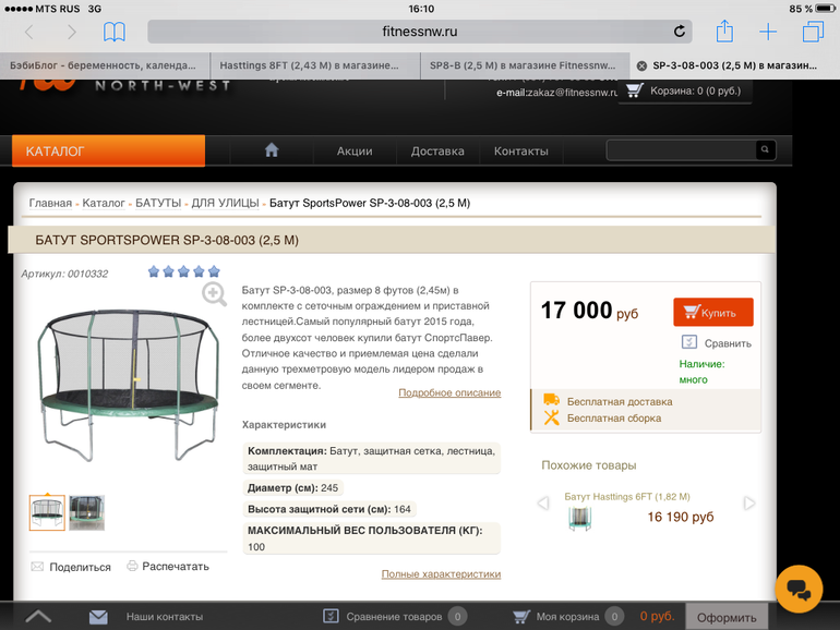Мы взяли в лете батут с сеткой за 6999 руб по акции ращмером 2,44 м! Обалденный!!!