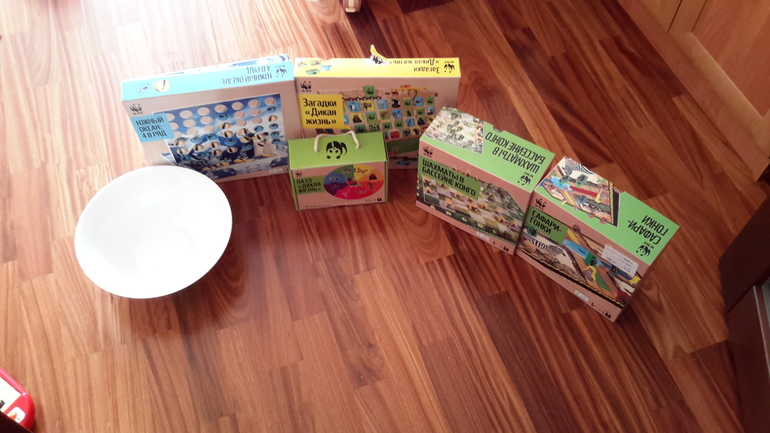 В воскресенье заехала в Фамилию купила игры WWF (до этого брали домино Амазонка и загадки дикой природы ) и салатник Люминарк. Вот, что купила.