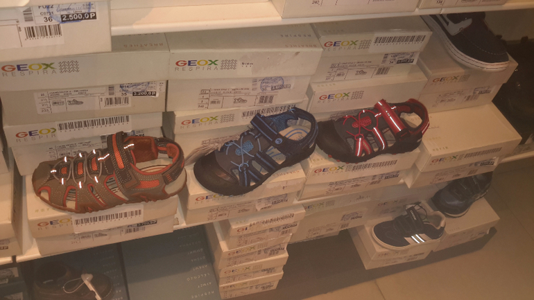Утром в субботу заехала в Аутлет Белая дача (была там первый раз). Ехали по делам и муж на часик завез посмотреть. Зашла в любимый geox (эту обувь покупаем мужу много лет, пару раз покупала туфли себе, сыну покупали две пары сандалей, качество всегда радует, правда цена очень сильно выросли в последнее время на мужскую обувь). Хотела купить сыну на осень и зиму сапоги или ботиночки. Выбор на мальчика не очень большой, на девочку гораздо больше. И размеров маловато. Я смотрела 22-24 Сфотографировала только для мальчика обувь: