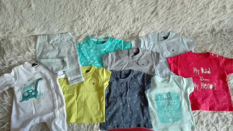 Курьер наконец привез мой заказ с Kiabi, везли всего 5 дней (включая выходные). Я в полном восторге от всего, а особенно от детских вещичек. Заказала футболок с застежками сзади на кнопочках и кармашками по 200 рублей за штуку, футболки с принтами и застежкой на плече - по 100! Внизу видно, как сын из живота любуется на свои обновки ) прошу прощения, что не глажено, но еще даже и не стирано, все ждет своего часа.