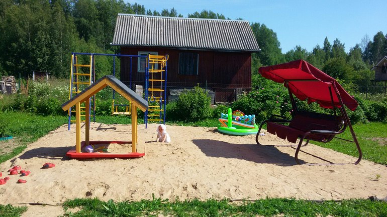 В прошлом году мы выровняли площадку, засыпали грунтом, песком, установили турники, качели, песочницу, детский бассейн приволокли маленький, и получилось очень даже неплохо. Малая в свой год игралась там с большим удовольствием.