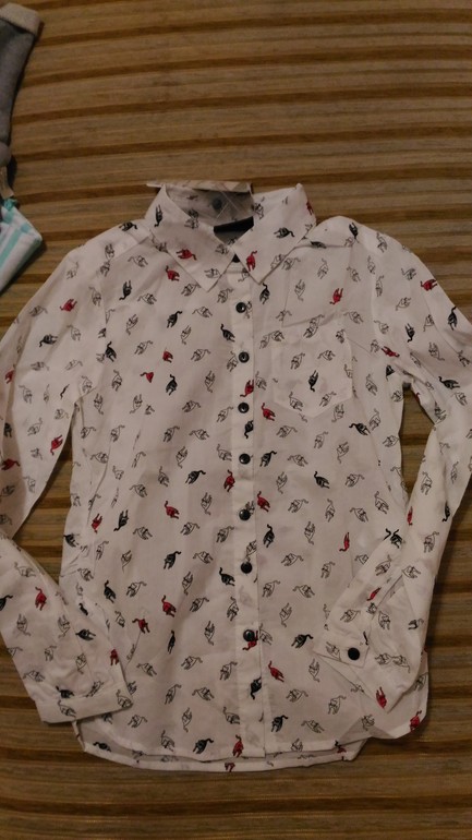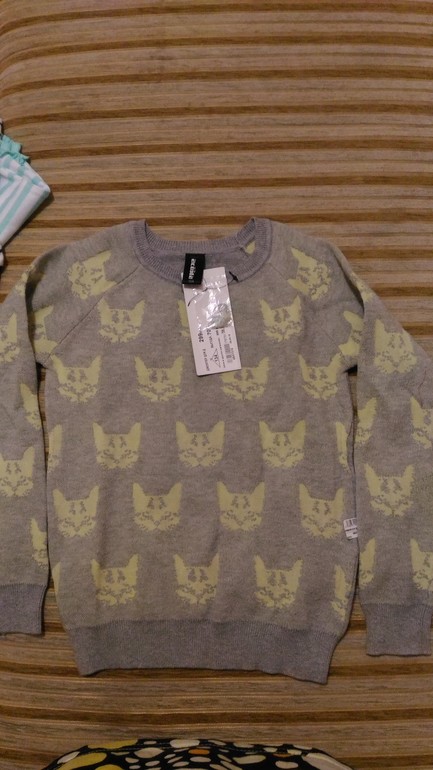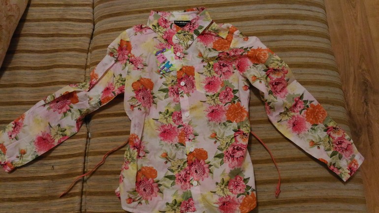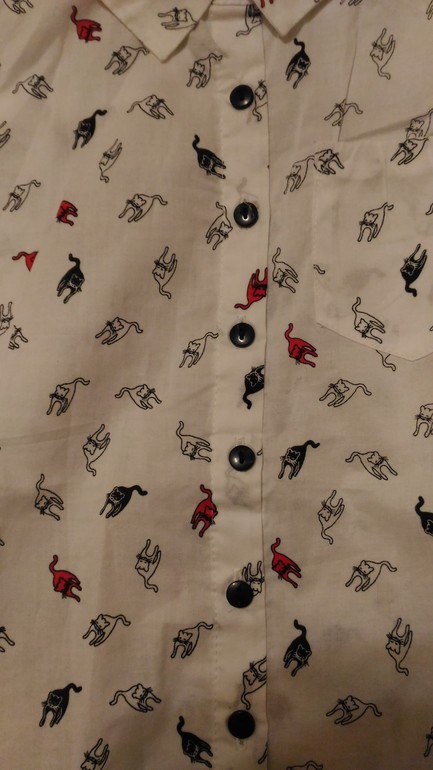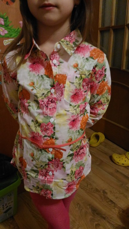 Я дочке рубашку цветастую взяла на вырост :) Сначала не очень чётким принт показался, но смотрится в итоге хорошо. А с кошками у нас очень большой размер висел, но она мне очень понравилась.
