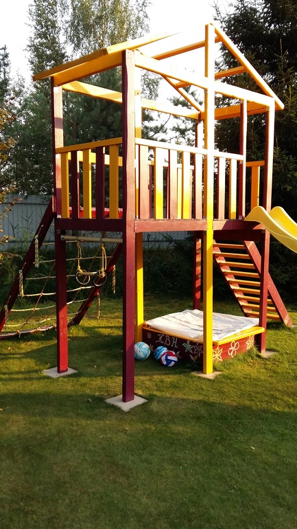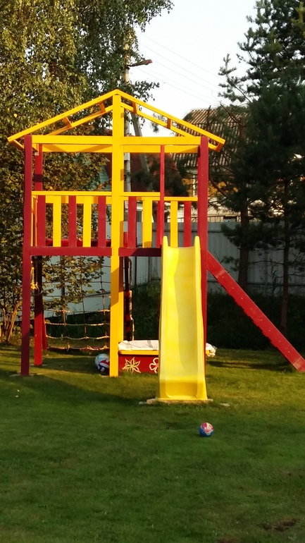 А я с телефона не вижу. У нас там морилкой крашено дерево под красное. а горка не помню из чего кстати.