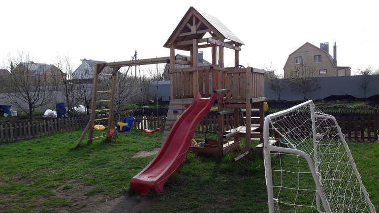 Горка 130 см. Просто все вряд ставить как то неудобно было. У нас деревья везде, чтобы тень на участке была. А качели пластиковые marinplast. Они для малышей безопаснее.