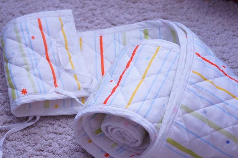 бортики повесили заранее с самого первого дня, но не на всю кроватку, а одну боковинку оставили, т.к. кроватка стоит у окна + часто открываем окно, а малышка в комнате в это время. Комплектов у нас несколько (3 шт) + мини бортики (2 шт). фото из инета. Плюс данных бортиков в том, что можно их использовать в манеже, когда вроде снизу нужно прикрыть, чтобы не дулу, но и малыш должен вас видеть. один раз малыша вырывало и поэтому несколько комплектов точно должно быть. Все подарили.