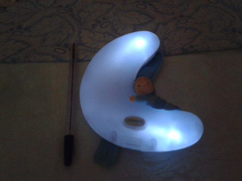 Очень классная вещь, т.к. светит в отличии от других не ярким светом, а матовым. Имеет два режима, но используем один. Первый - просто светит 15 мин. Второй - светит 15 мин, но мигая. Использую ночью, когда нужно поменять подгузник. Яркий свет может разбудить, а тут матовый и не сильно яркий. Но ночью в темной комнате всё хорошо видно! Можно закрепить на кроватку, но я держу просто. покупала на авито за 300