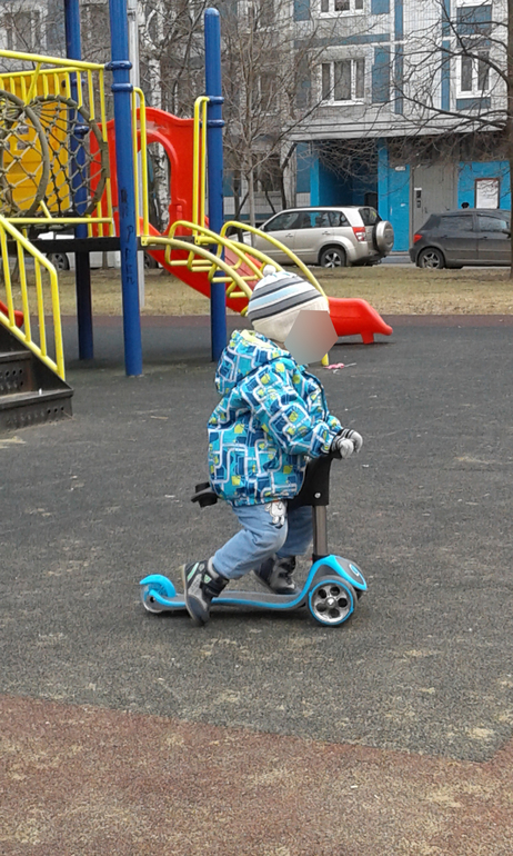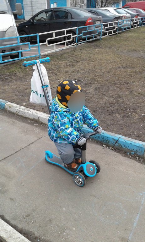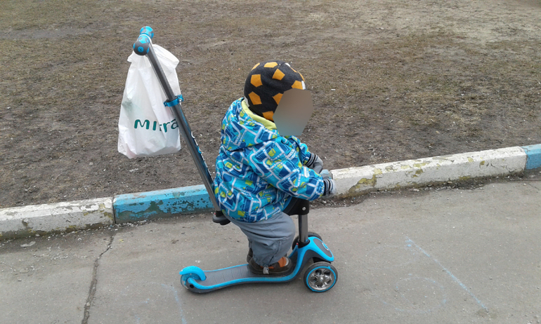 Что мы имеем: сын часто стал отказываться от коляски, велосипед с ручкой я брать не хотела (тяжёлый и при этом не полная замена коляски), на обычном самокате у него пока не получается кататься чисто физически (кто-то в нашем возрасте уже гоняет, видела, сын пока нет), толокар есть дома (на улицу его таскать не хочется).