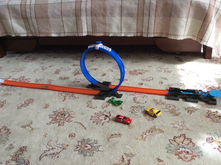 Трек Hot wheels. А началось все с безобидного катания машинок на площадке. Трек нам очень понравился и он с продолжением. Можно еще докупить элементы и пускать машинки по всей комнате.