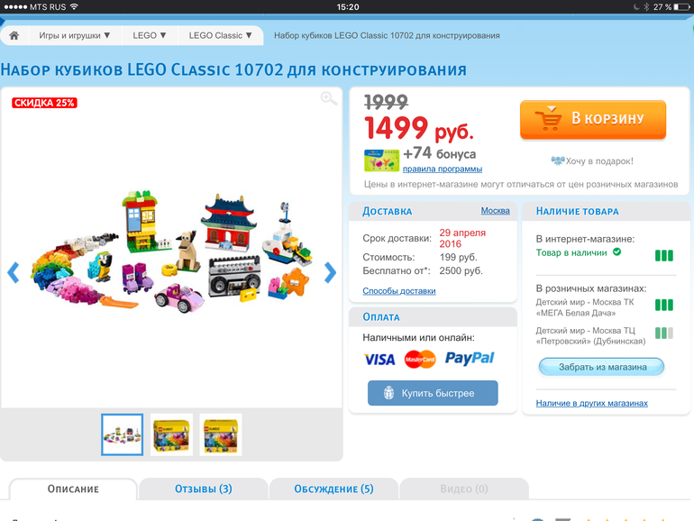 ниже девочка кинула скрин с детского мира, еще во многих магазинах такие цены по поиску модели 10702, 1499 р. за 585 деталей, получается тоже на то же . , а вот около 500 деталей с коробкой пластиковой - 1700 р. здесь